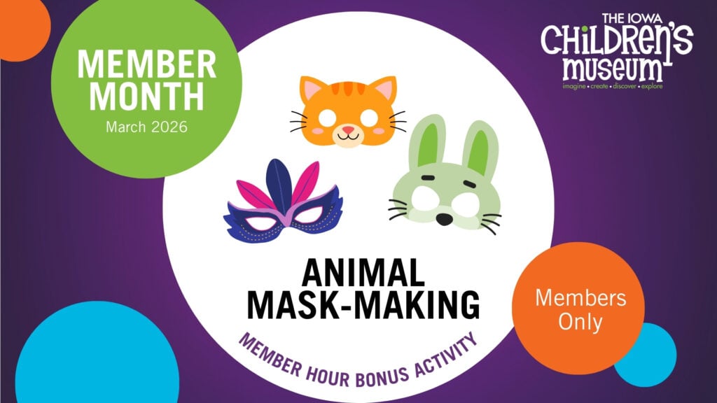 Members of The Iowa Children’s Museum are invited to come play when The ICM is ONLY open to members! Member Hour is 9-10 a.m. every Wednesday, Thursday, Friday, and Saturday. Come play early and enjoy a less busy environment! Learn more about membership here.